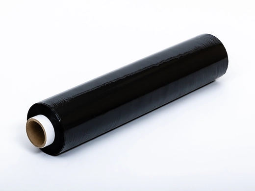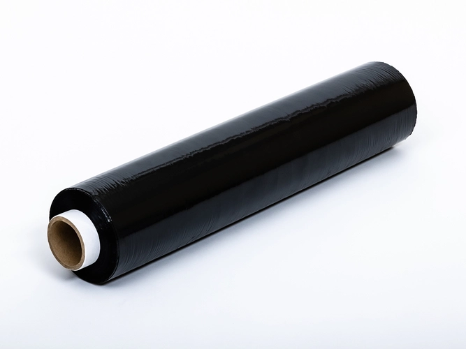 - Czarna rolka folii stretch o wadze 3kg brutto (2,7kg netto) o grubości 23 mic.