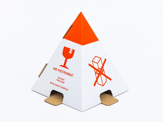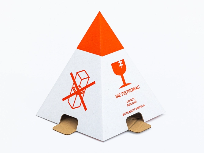 Dzięki sztywnej, 3-warstwowej konstrukcji z tektury falistej typu B, stożek tworzy wyraźną barierę, która uniemożliwia ułożenie kolejnego ładunku na palecie. Jego obecność wymusza ostrożność i respektowanie zasad transportu, co jest szczególnie istotne przy produktach delikatnych, wrażliwych na nacisk lub łatwych do uszkodzenia.